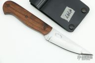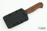 This Peshkabz by Bud Nealy features a compound ground San Mai Damascus blade w/ full tang construction, .113" blade stock and 1.033" blade depth. Desert ironwood scales. Includes kydex sheath, extra attachments for the sheath, original box and papers. Excellent Condition.
