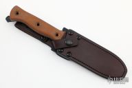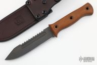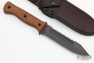This Pilot Knife by Dave Wenger features a black blade with sawteeth on the spine, .169" blade stock and 1.160" blade depth, full tang construction. The handle has natural linen micarta scales. Comes with a leather sheath. Excellent condition.