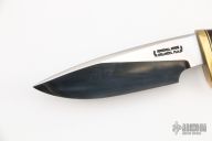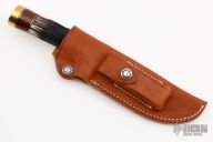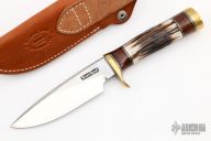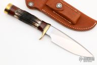 The Model 25-5 by Randall Made Knives is a drop point hunter similar to Model 11, but handle construction is reminiscent of 1930′s design. Excellent skinning, outdoors knife. This knife has a carbon steel blade with notched thumbrest, .209" blade stock and 1.343" blade depth, hidden tang construction. The handle brass guard and pommel, stag grip with stacked leather, black and brass spacers. Comes with brown leather sheath. Has a few light scratches, otherwise excellent condition.