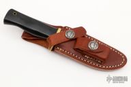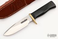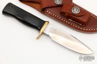 This Miniature model 28 features a satin finished drop point blade with notched thumbrest, .185" blade stock and .910" blade depth, full tang construction. The handle has a brass guard, black micarta grip and lanyard hole. Each miniature Randall model has a transponder in the handle matching the serial number of the knife, in this case "RKS 952". Comes with brown leather sheath. Excellent condition.