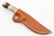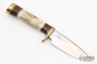 This is a RARE Model 25 Mini by Randall Made Knives, it is #053 of only 1500 made by Randall between 1996 and 1998. Identical to the standard Model 25 but scaled down. Has a drop point blade with false top edge, notched thumbrest, .150" blade stock and .896" blade depth, hidden tang construction. The handle has a brass guard and butt with a stacked leather and stag handle, black and brass spacers. Comes with brown leather sheath. Excellent condition.