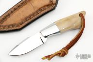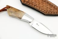 This Utility by D'Alton Holder features a mirror polished blade with .150" blade stock and .822" blade depth, full tapered tang construction. The handle has stainless steel bolsters, mammoth ivory scales with black liners. Comes with leather sheath. Excellent condition.