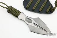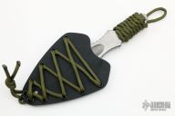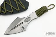 This Apocalypse Spearhead by Angryman Knives features a double edged blade with fullers, thumb and finger grooves, notched tang, .252" blade stock and 2.385" blade depth, full tang construction with paracord wrap. Comes with a kydex sheath. New from maker.