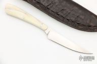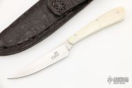 This knife by Arno Bernard features a hand rub satin finished blade, .115" blade stock and .570" blade depth, full tapered tang construction. The handle has warthog tusk scales. Comes with a black leather sheath. Excellent condition.