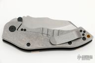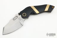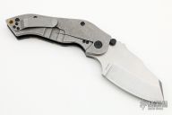This knife has a satin finished stainless San Mai Damascus blade with fullers, notched thumbrest and dual thumbstuds. The handle has black G-10 scales with bronze inlays and pivot collars, tumbled titanium frame and tip up clip. Has stainless lockface insert with integral over travel stop. #098/250. Comes with original packaging and makers card. Has a couple light scuffs, excellent condition otherwise.