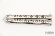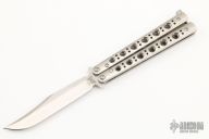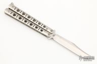 This Model 63 Balisong by Benchmade features a clip point blade with swedge. The handle has a skeletonized stainless steel construction over steel spacers, t-latch. Comes with original sheath. Excellent condition.
