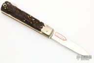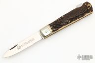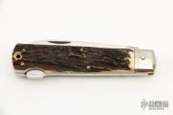This legendary knife features a partially serrated satin finished stainless steel (Rostfrei) blade. The handle has nickel silver bolsters, stag scales, brass liners and stainless steel springs. Lock tab is stamped "18481". Comes with original box and papers. Excellent condition.