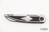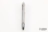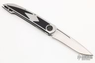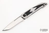 This Reaper D/A auto by Jeffrey Harkins features a hand rubbed satin finish blade with a thumbhole. The handle has a two-tone stainless steel frame with ebony wood inlays, inlaid linerlock, blued steel pivot. Great looking materials and finish work. Nice leaf-spring action with a nice detent and blade seating. Has a few very light scratches, otherwise excellent condition. Comes with a zippered case.