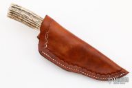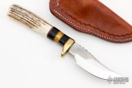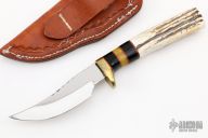 This Skinner by RA Matt features a mirror polished blade with fileworked spine, .154" blade thickness and 1.130" blade depth, hidden tang construction. The handle has a brass guard, stag grip, red/black/acrylic spacers. Comes with a hand tooled brown leather sheath. Has some light scratches, otherwise excellent condition.