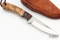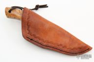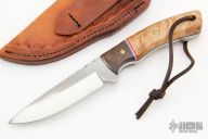 This Hunter by RA Matt features a mirror polished blade with fileworked spine, .155" blade thickness and 1.069" blade depth, full tang construction. The handle has wood bolsters, burl wood scales with brass pins and black liners. Comes with a hand tooled brown leather sheath. Has some light scratches, otherwise excellent condition.