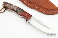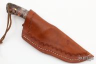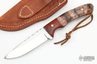 This Hunter by RA Matt features a mirror polished blade with fileworked spine, .155" blade thickness and 1.068" blade depth, full tang construction. The handle has wood bolsters, burl wood scales with brass pins and red liners. Comes with a hand tooled brown leather sheath. Has some light scratches, otherwise excellent condition.