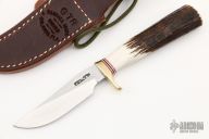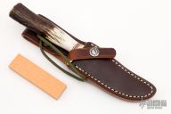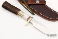 The GTR Special by Randall Made Knives is a non-catalog model, suitable for small hunting and fishing needs. This knife has a stainless steel blade with .155" blade stock, .875" blade depth, hidden tang construction. The handle has a brass guard, red/white/blue spacers, and a stag grip. Comes with brown leather sheath and original paper wrapping. New from maker.