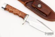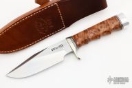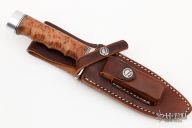 This Sergeant's Special by Randall Made Knife features a satin finished blade with sharpened top edge and a notched thumbrest, .216" blade stock and 1.374" blade depth, hidden tang construction. The handle has a nickel silver guard with a Thuya burl wood grip and black/duralumin spacers, duralumin butt. Finger groove style handle. Comes with a brown leather sheath and original paper wrapping. New from maker.