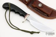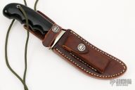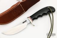 This Model 20 Ward Gay Special (non-catalog model) features a satin finished upswept carbon steel blade with notched thumbrest, .198" blade stock and 1.124" blade depth, hidden tang construction. The handle has a nickel silver guard, black linen micarta grip, red/white/black spacers and a lanyard hole at the butt. Comes with brown leather sheath and original paper wrapping. New from maker.