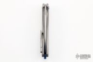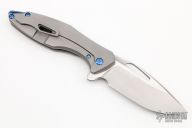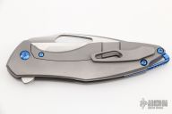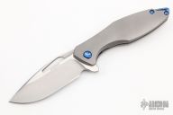This Arius Flipper by Koenig knives features a burnished with PF blade with thumbhole and flipper. The handle has a bead blasted and smooth titanium frame anodized titanium backspacer and a bead blasted tip up clip with hidden screws. Has ceramic bearings and a ceramic detent ball. Nice detent, lockup and blade seating. Comes with original box and COA dated September 23, 2022. New condition.