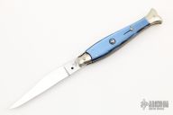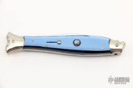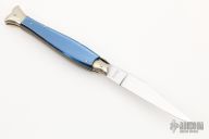 This Fish Picklock by AKC Italy features a mirror polished clip point blade. The handle has nickel silver bolsters and butt, acrylic scales, brass liners and a stainless steel backspacer. Has safety. Nice action and lockup. Excellent condition.