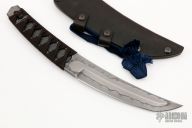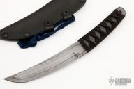 This Tanto by David Brown features an upswept blade with nice hamon, .193" blade stock and 1.147" blade depth, full tang construction. The handle has black cord wrap over carbon fiber inlays. Comes with a black leather sheath. Excellent condition.