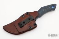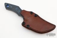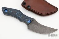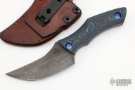 This Genesis Slim Line by Jake McCoy features an acid tumble finished upswept blade with false top edge, .217" blade stock and 1.588" blade depth, full tang construction with black/blue carbon fiber scales and anodized titanium hardware. Comes with a brown leather sheath by Chatanooga Leatherworks. Excellent condition.