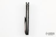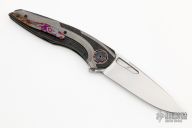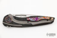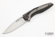 This Sukhoi-4 from Custom Knife Factory features a matte finished drop point blade with notched thumbrest and flipper. The handle has a stonewashed titanium frame with carbon fiber inlays, black titanium backspace, ZircuTi pivot collars and tip up clip. Has black hardware. Comes with velcro case, COA and extra hardware. New condition.