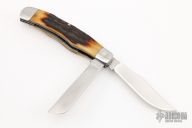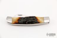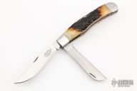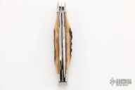 This slipjoint by Harold Brown features satin finished blades with nail nicks. The handle has dovetailed stainless steel bolsters with integral liners, stag covers, and stainless steel springs. Comes with a zippered case. Excellent condition.