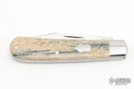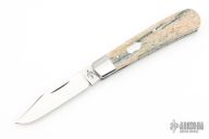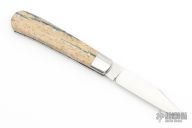 This slipjoint from T.A. Davison features a hand rub satin finished clip point blade with nail nick. The handle features brown canvas giraffe bone covers with stainless bolsters over stainless liners, a stainless steel scutcheon, and spring. Spring is flush in the closed, half stop, and open position. Nice blade seating and function. Comes with zippered case. New from maker.