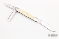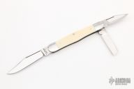 This 3-Blade Swell Center slipjoint by Rick E Browne features hand rub satin finished blades with nail nickls. The handle has dovetailed stainless steel bolsters with integral liners, mammoth ivory covers, stainless steel springs. Has half-stops, flush in all positions. Comes with a zippered case. Has a small ding on one of the bolsters, otherwise excellent condition.