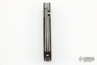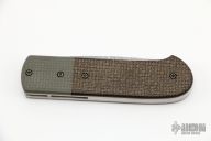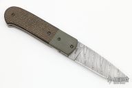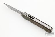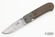 This EDC folder has a Bjorkmans Twist Damasteel blade with single thumbstud. The handle has green G-10 bolsters and green canvas micarta scales, titanium liners and a stainless steel clip that retracts into the spine. Smooth action. Nice blade seating, detent, and lockup. Excellent work. Excellent condition. Comes with a felt case.