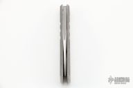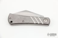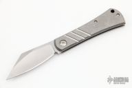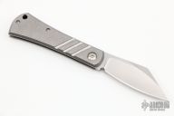 This G.A.F. by James Brad Blount features a tumbled clip point blade with swedge. The handle is comprised of a liner less tumbled titanium frame over a matching steel spring. Lanyard hole in pommel. Strong pull and the spring is flush in the open, closed and half stop positions. New condition. Comes with a brown leather pocket sheath.