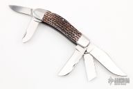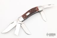 This slipjoint by Rick E Browne features hand rub satin finished blades with nail nicks and fileworked spines. Has half-stops, flush in all positions. The handle has dovetailed stainless steel bolsters, jigged bone covers with a stainless steel escutcheon, coin edged stainless steel liners, fileworked stainless steel springs. Comes with a zippered case. Excellent condition. #002