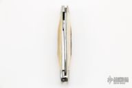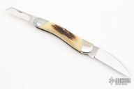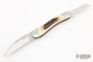 This Slipjoint by Robert Enders features a mirror polished blades with nail nicks. The handle has fluted and pinched nickel silver bolsters with integral liners, stag covers, stainless steel springs. Half stops on blades. Comes with a zippered case. Has a couple very light scratches, otherwise excellent condition.