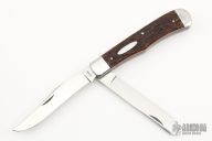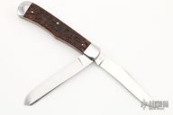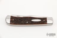 This slip joint by Terry Davis features hand rub satin finished blades with nail nicks. The handle has stainless steel bolsters with integral liners, stainless steel springs, jigged bone covers with a stainless steel escutcheon. Comes with a zippered case. Excellent condition. Dated 2001.