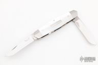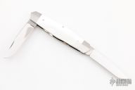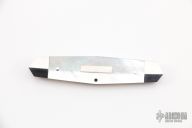 This 2-Blade slipjoint by Ryuichi Kawamura features mirror finished blades with nail nicks. The handle has stainless steel bolsters and liners, mother of pearl covers, stainless steel spring and escutcheon. Has half stop, flush at all positions. Excellent condition. Comes with a zippered case.