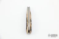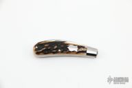 This Swayback Gents from Tony Bose is #6, it features a hand rub satin finished blade with nail nick. The handle has polished stainless steel bolsters, stag covers, stainless steel liners, escutcheon and spring. Half stop, flush in all positions. Comes with a zippered case. Excellent Condition.