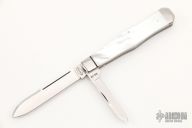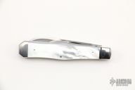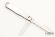 This 2-Blade slipjoint by Dan Burke features hand rub satin finished blades with nail nicks. The handle has stainless steel fluted bolsters, mother of pearl covers, stainless steel liners and spring. Has half-stops, flush in all positions. Includes a padded zippered case. Excellent condition.