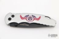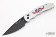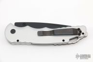 This Tactical Response 4 by Pro-Tech has a black blade with a plain edge, and single thumbstud. It has a silver aluminum handle with black stainless steel clip. Steel glass breaker. Comes with original box, sheath and papers. Excellent condition. #54 of 200