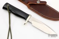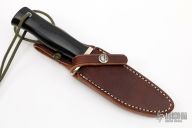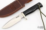 The Model 28 by Randall Made Knives is an excellent skinning and outdoors knife. Has a satin finished drop point blade with false top edge and notched thumbrest, stainless steel blade, .175" blade stock and 1.143" blade depth, full tang construction. The handle has a nickel silver guard, black linen micarta handle and a lanyard hole at the butt. Comes with brown leather sheath.  Excellent Condition.