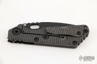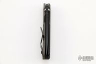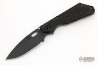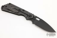 This SNG by Strider Knives features a black blade with notched thumbrest and thumbhole. The handle has a Frag pattern black G-10 and flamed titanium frame with matching tip up clip. Nice detent, lockup and blade seating. New condition.