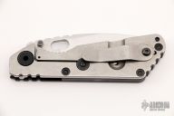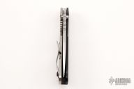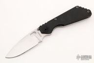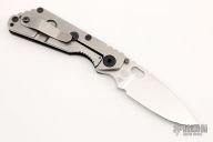 This Strider SNG framelock folder features a stonewashed blade with thumbhole and notched thumbrest. The handle has a black G-10 and stonewashed titanium frame with titanium clip, tip up carry. Jimping on blade spine. Nice lockup, detent, and blade seating. Has scuffs and scratches throughout, good user condition.