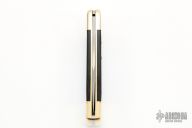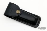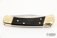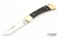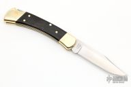 This Buck 110 has a satin finished clip point Magnacut blade with nail nick. The handle has a brass frame with wood inalys and a stainless steel backspacer. Comes with original leather sheath, box and papers. Excellent condition.