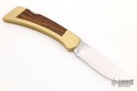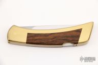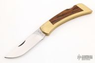 This Folding Sportsman by Gerber features an upswept blade with nail nick. The handle has a brass frame with wood inlays. Excellent condition. Comes with original box and papers. Comes with original brown leather sheath.
