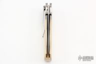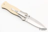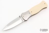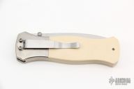 This folding linerlock from A.T. Barr features a satin finished dagger blade and dual thumb studs. The handle has titanium bolsters and ivory micarta scales over titanium liners and micarta backspacer. Has a satin finished stainless steel tip down pocket clip.  Light scratches are visible on the handle otherwise the knife is in excellent condition.
