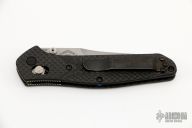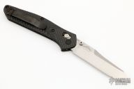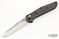 The Warren Osborne designed Benchmade 940 is a popular knife for good reason. It's a comfortable everyday carry knife with its slim design, great ergonomics and lightweight. The 940-1 has a premium CPM-S90V steel blade with a plain edge and a stonewash finish. The carbon fiber handle has stainless steel liners and blue anodized aluminum barrel spacers. The AXIS lock and reversible pocket clip make the knife usable for right and left-handers. Includes the original box and papers. Excellent Condition.