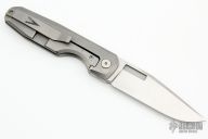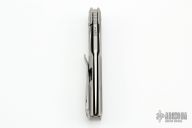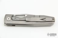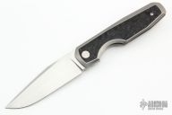 This Isotope by Vero Engineering features a hand rub satin finished blade with notched thumbrest and flipper. The handle has a tumbled titanium frame with marble carbon fiber inlay, satin titanium hardware, tumbled titanium tip up clip. Nice detent, lockup and blade seating. Comes with a zippered case and COA. Has a some scratches, otherwise good condition. #381.