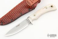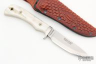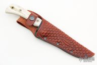 This knife by Diamond Blade features a friction forged D2 blade with notched thumbrest.  .116" Blade Stock.  1.033" Blade Depth. The handle has stainless steel guard, stag scales with mosaic pins and a lanyard hole. Comes with brown leather sheath.  Excellent Condition.