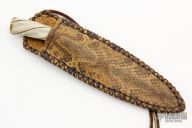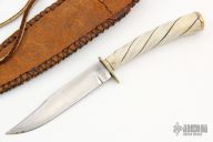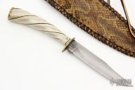 This knife is marked "TS" on the blade, has a hand rub satin finish and false top edge, .108" blade stock and .708" blade depth, hidden tang construction. The handle has a brass guard, spiral fluted bone grip with a brass butt with a cross overlay. Comes with a leather neck sheath with snake skin overlay. Has some scratches and patina, otherwise good condition.