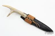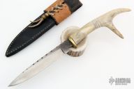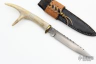 This knife is marked "TS" on the blade, has a hand rub satin finished blade made from a mill bastard file, fileworked spine, .134" blade stock and .730" blade depth, hidden tang construction. The handle has a brass guard, stag tine antler grip with a nickel silver pin. Comes with a black leather sheath marked "XMAS '06". Has some scratches and patina, otherwise good condition.
