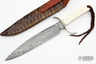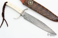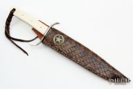This knife by "RC"? (it think it is RC, let us know if you recognize this maker) features a Damascus blade with .164" blade stock and 1.322" blade depth, full tang construction The handle has a nickel silver guard and mammoth ivory scales. Comes with a brown leather sheath with snake skin inlay. Has some light scratches and patina, otherwise excellent condition.