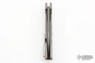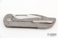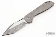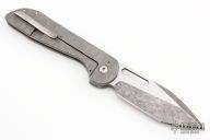 This knife by Nova Blades features a two-tone tanto blade with false top edge and thumbhole. The handle has a tumble finished and rock textured titanium frame with an orange peel finished backspacer and titanium tip up clip with hidden screws. Rides on bearings, nice detent, lockup and blade seating. Excellent condition.