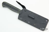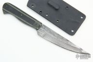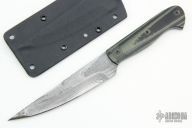 This Peshkabz by Bud Nealy features a compound ground Damascus blade w/ full tang construction, .118" blade stock and 1.084" blade depth. Textured Black/Green G-10 scales. Includes kydex sheath. Excellent Condition.