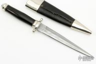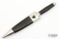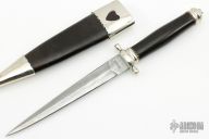 This Dagger by Master Smith Don Hastings features a 3-Bar Damascus double edged blade with .159" blade stock and .809" blade depth, hidden tang construction. The handle has a nickel silver guard and butt, ebony grip. Comes with a black leather and nickel silver sheath. Excellent condition.